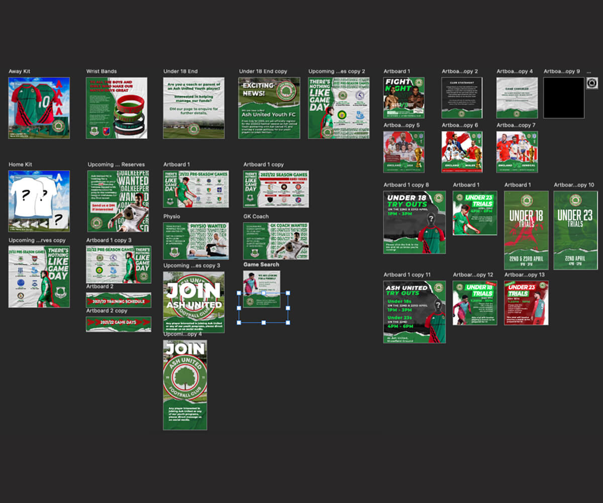 A key focus of the project was strengthening Ash United FC’s social presence. I designed a comprehensive set of social media templates covering: